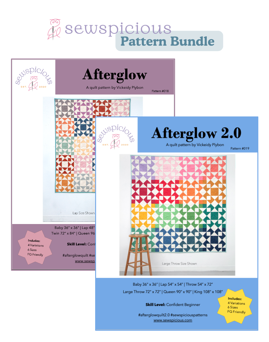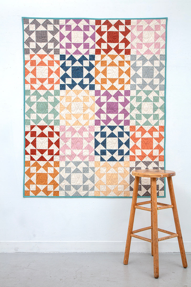 Afterglow is my modern take on a classic star quilt. It’s a quick, easy, and fat quarter friendly pattern that combines elements of two of my favorite traditional blocks: the Churn Dash and the Nine Patch. This updated design puts a bold, contemporary spin on timeless shapes, making it a fun and satisfying project for quilters of all levels.